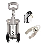 Housed in a handsome gift box, this wine set features a professional-style, double-level, steel corkscrew with glass protector ring, rubber inserts, and a satin finish. Also included are a translucent ABS foil cutter with carbon-steel cutting wheels and a universal stopper. This item is made in Italy.